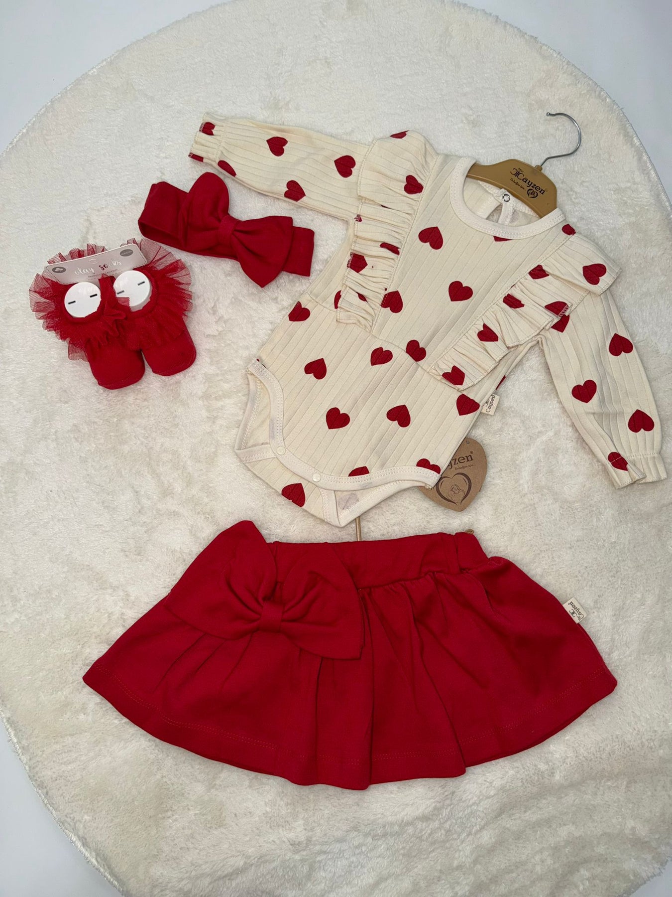Takımın yıldızı olan fırfır detaylı ve fitilli zıbın, kalpli desenleriyle çok sevimli bir görünüme sahip. Pamuklu kumaşı ve esnek yapısı sayesinde bebeğiniz gün boyu içinde çok rahat edecek. Kombini tamamlayan kurdeleli etek, tarzıyla fark yaratırken; sete dahil olan uyumlu bandana ve tütülü çoraplar zahmetsiz bir şıklık sağlıyor.