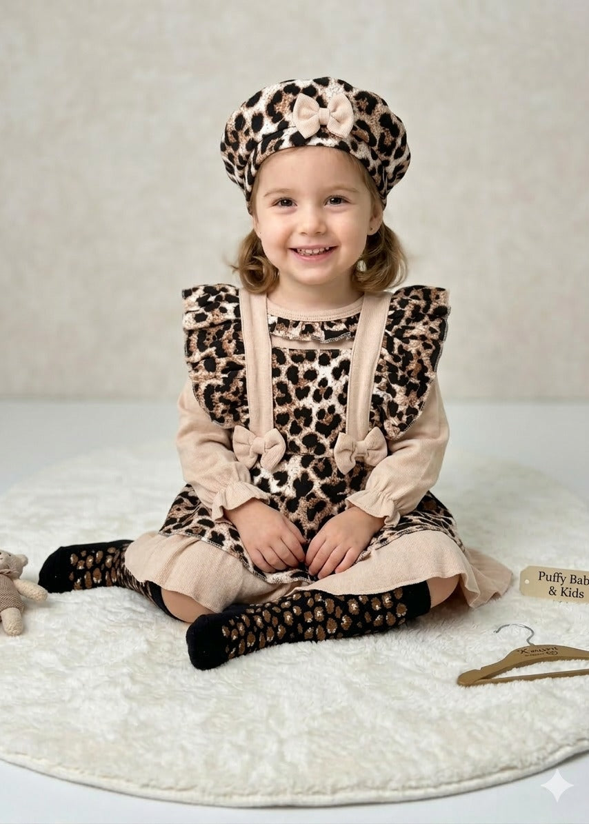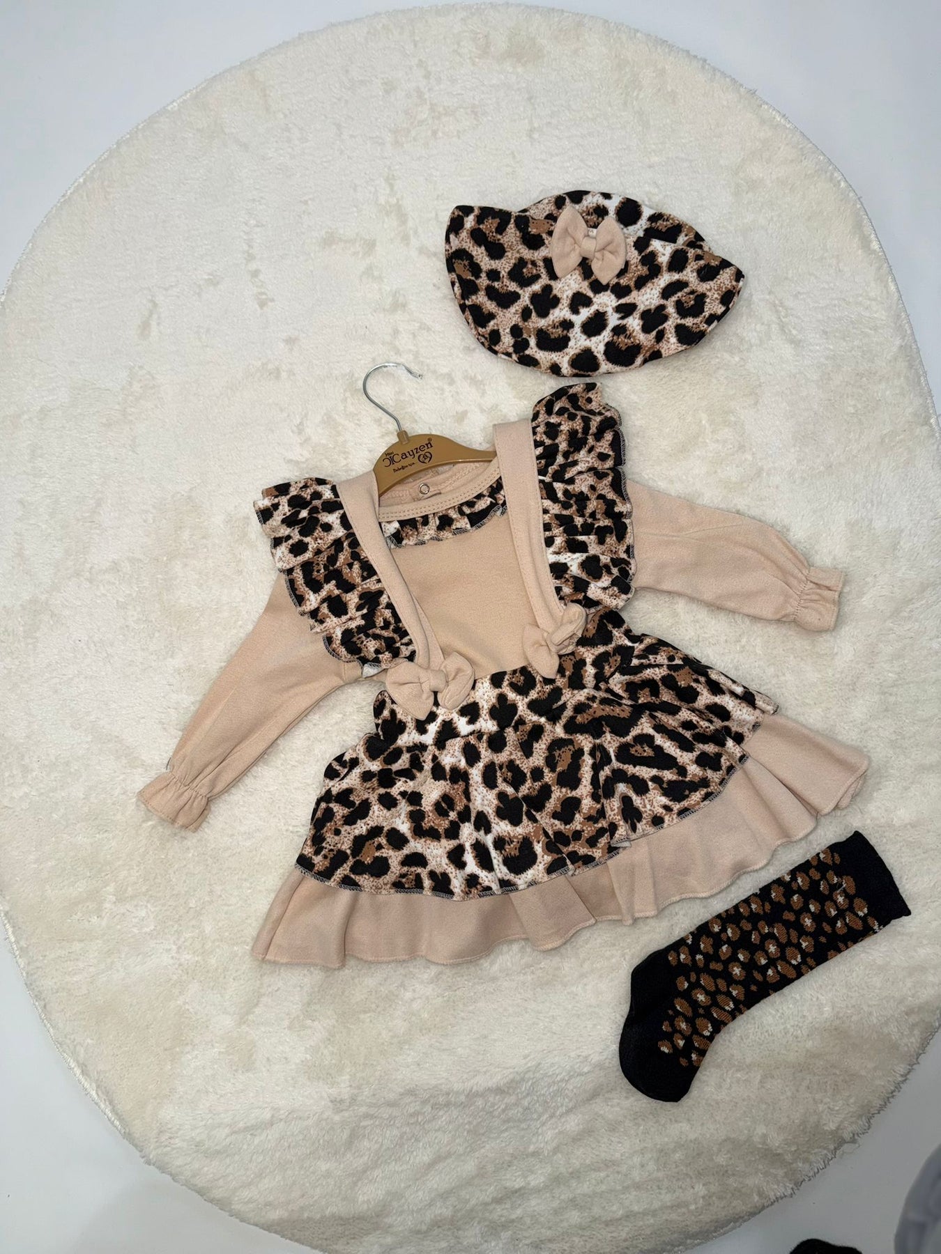 Takımın ana parçası olan leoparlı elbise fırfır ve kurdele detayları ile şıklığına şıklık katıyor. Pamuklu ve esnek kumaşı ile bebeğiniz gün boyu konforlu geçirecek. Şık şapkası ve yine leopar desenli diz boyu çorabı ile kombininiz tamamlanıyor. Bebeğinizin içinde çok konforlu hissedeceği bu set vazgeçilmeziniz olacak.