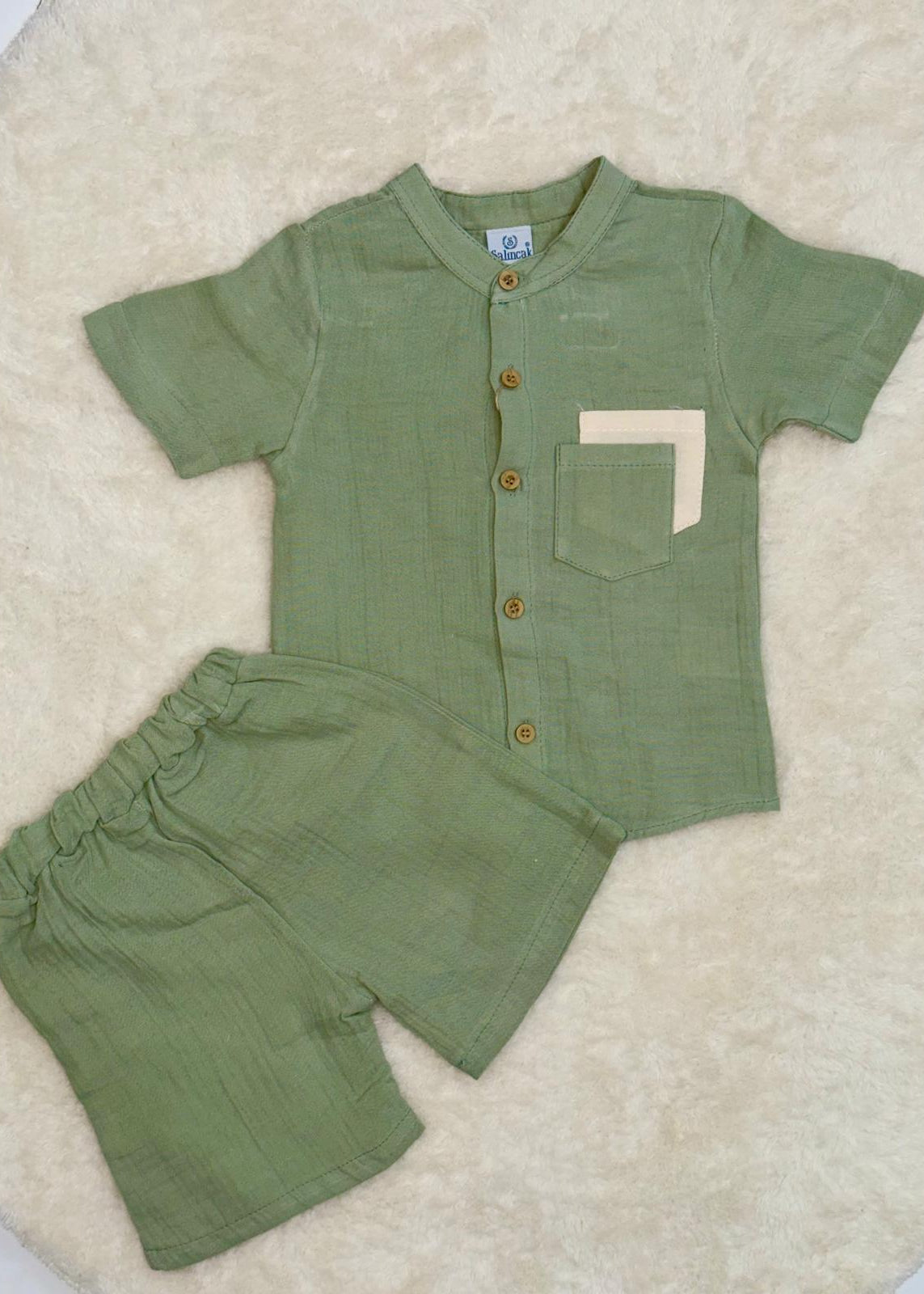 %100 doğal müslin kumaştan üretilen bu ikili set, nefes alan ve terletmeyen yapısıyla sıcak yaz günleri için en sağlıklı tercihtir. Hakim yaka gömleği ve cep detaylı tasarımıyla modern bir şıklık sunarken, yumuşacık dokusu ve esnek şort beli sayesinde çocuklara sınırsız hareket özgürlüğü sağlar. Yıkandıkça daha da yumuşayan bu özel doku, ütü gerektirmeyen doğal görünümüyle hem bebeklerin konforunu hem de ebeveynlerin rahatlığını ön planda tutar.