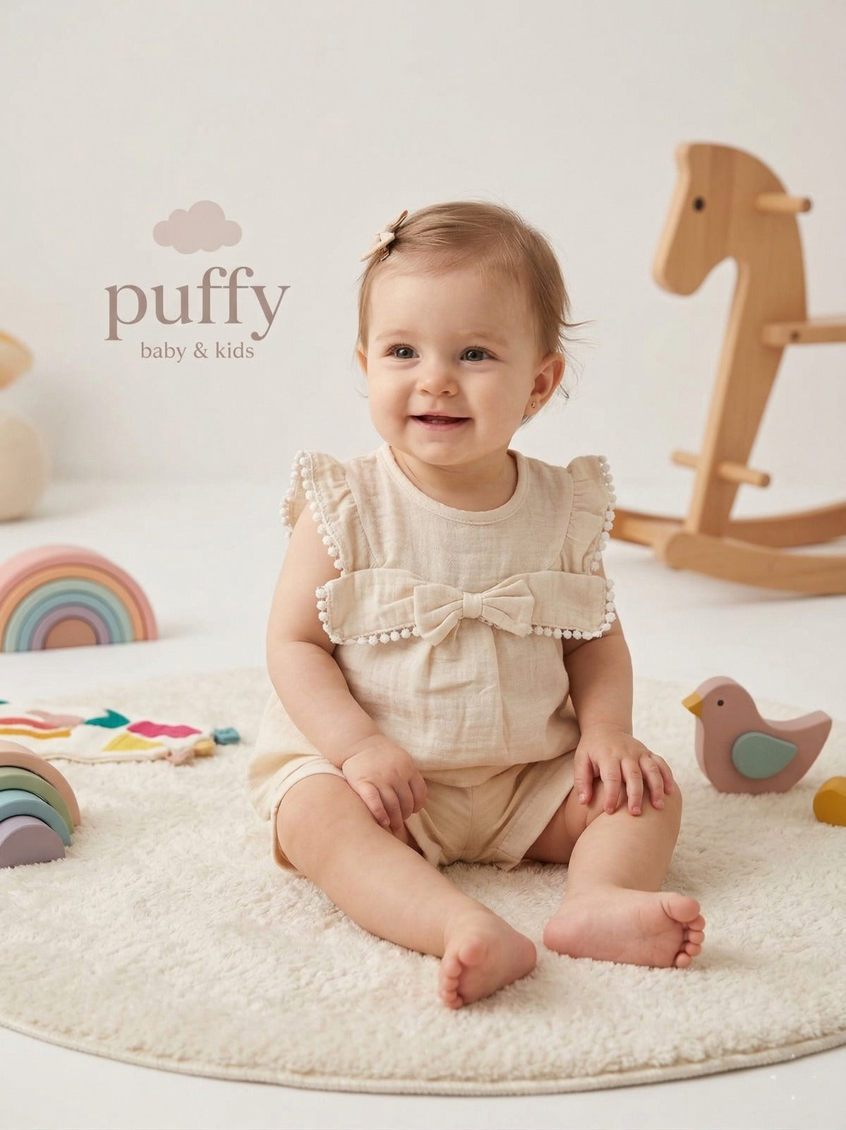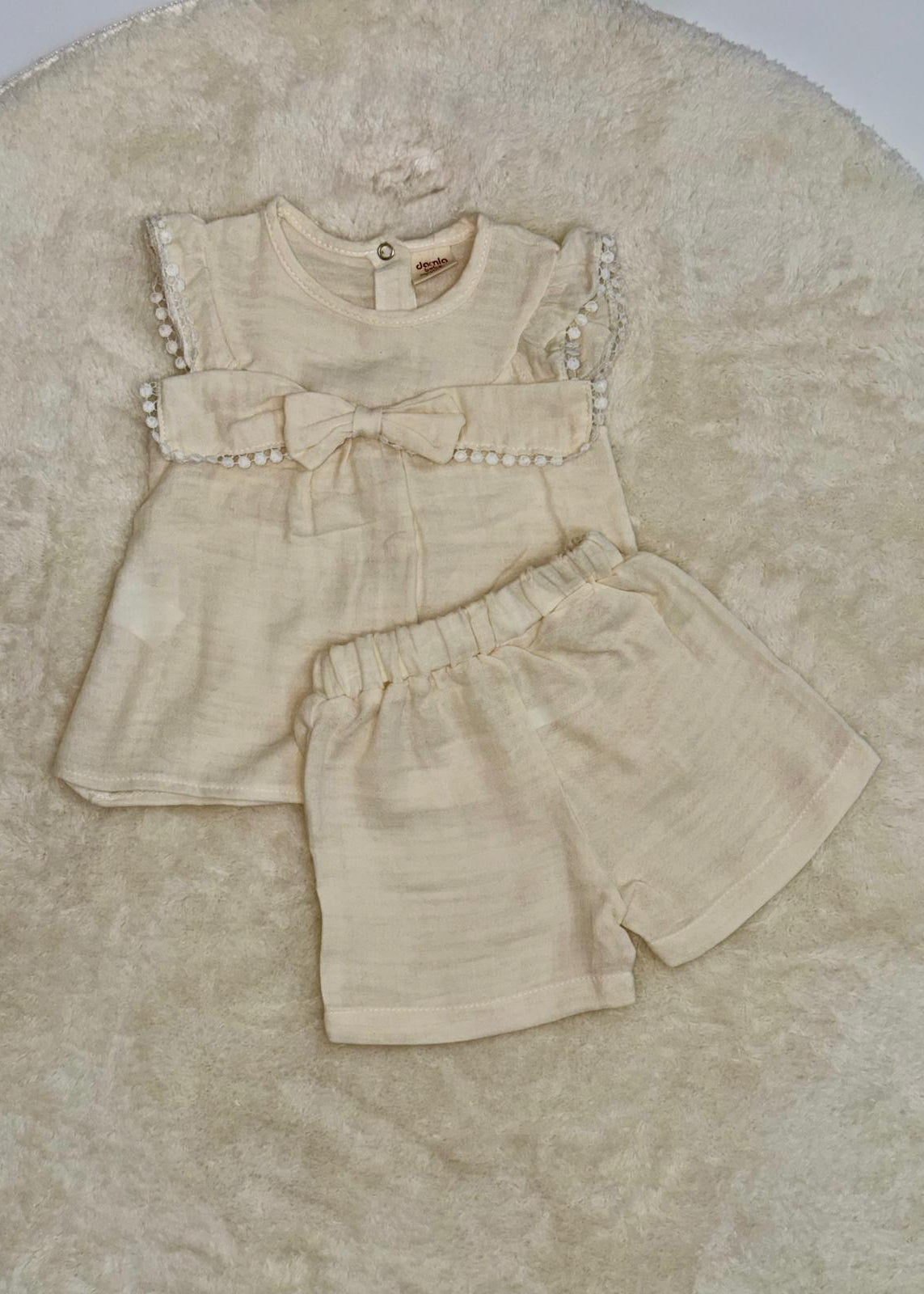 Miniklerin hassas tenine en doğal dokunuşu sunan %100 pamuk müslin kumaşın ferahlığını, vintage esintili şık detaylarla bir araya getirdik. Takımın göğüs kısmındaki göz alıcı büyük kurdele detayı tasarıma masalsı bir hava katarken, omuzlardaki volan kesim kolların uçlarında yer alan zarif fisto ve minik ponpon işlemeleri şıklığı en ince ayrıntısına kadar tamamlıyor. Nefes alan, terletmeyen dokusu sayesinde en sıcak günlerde bile konforlu bir kullanım sunan bu ikili set, beli lastikli rahat şortu ve arkadan çıtçıtlı pratik üstüyle hem ebeveynlerin hem de çocukların favorisi olacak. Doğal dokusuyla ütü gerektirmeyen bu takım, günlük şıklığın en yumuşak halini temsil ediyor.